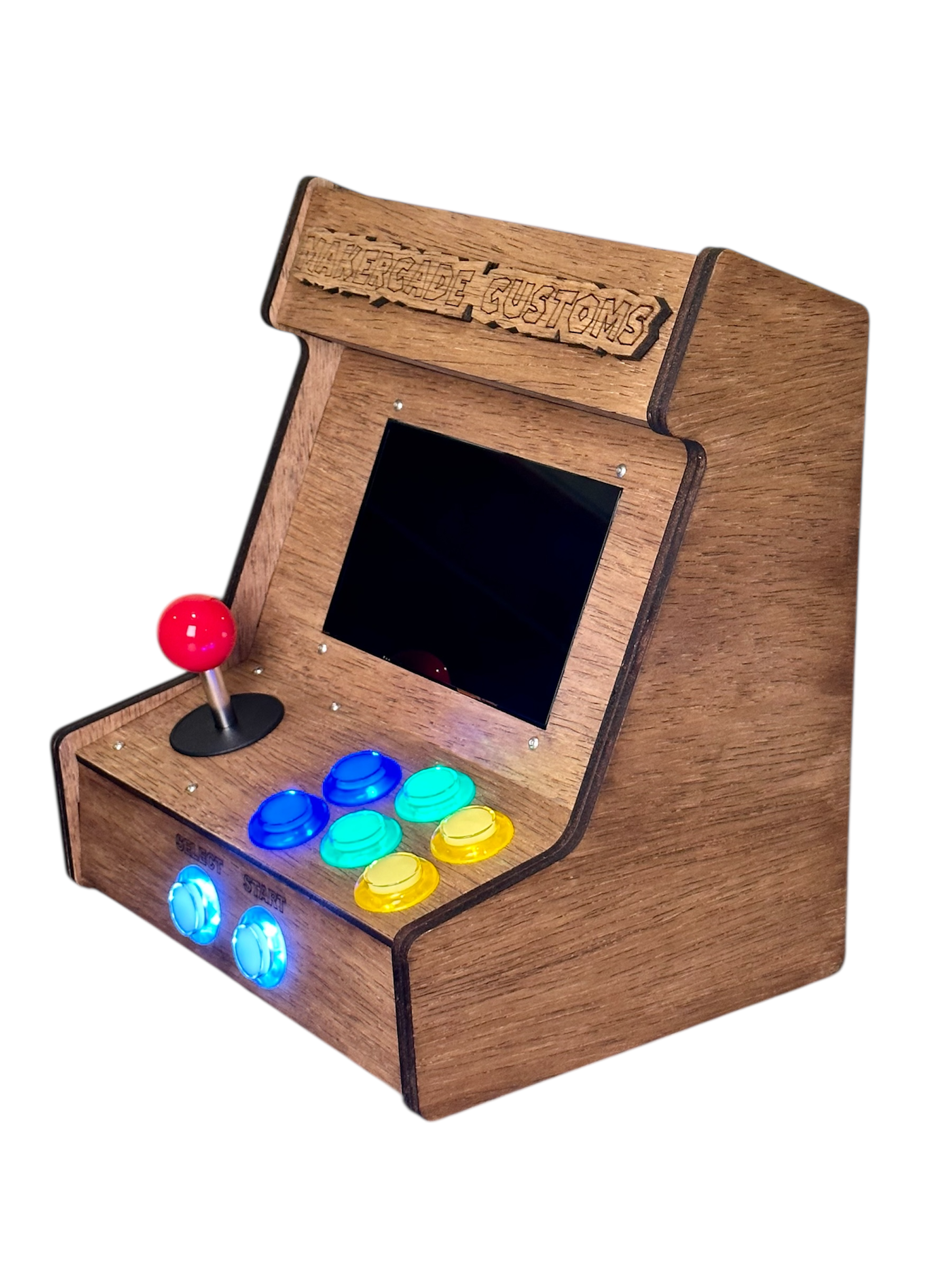 For an extra personal touch, custom engraving and stain finish is available at an additional cost, making this mini arcade cabinet a perfect one-of-a-kind gift for family, friends, or retro gaming fans. Please reach out to us to discuss.